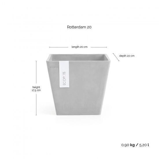 Η σειρά Ecopots Rotterdam ξεχωρίζει για τον μοντέρνο σχεδιασμό της, με καθαρές, ευθείες γραμμές που ταιριάζουν σε κάθε σύγχρονο χώρο. Περιλαμβάνει τα μοντέλα Rotterdam, Rotterdam Mid High και Rotterdam High, καθώς και ασορτί πιατάκια για ολοκληρωμένη αισθητική. Όπως όλες οι γλάστρες Ecopots, έτσι και η Rotterdam κατασκευάζεται από ανακυκλωμένα υλικά και διαθέτει διακριτικό, χειροποίητο φινίρισμα που προσθέτει κομψότητα και φυσικό χαρακτήρα.